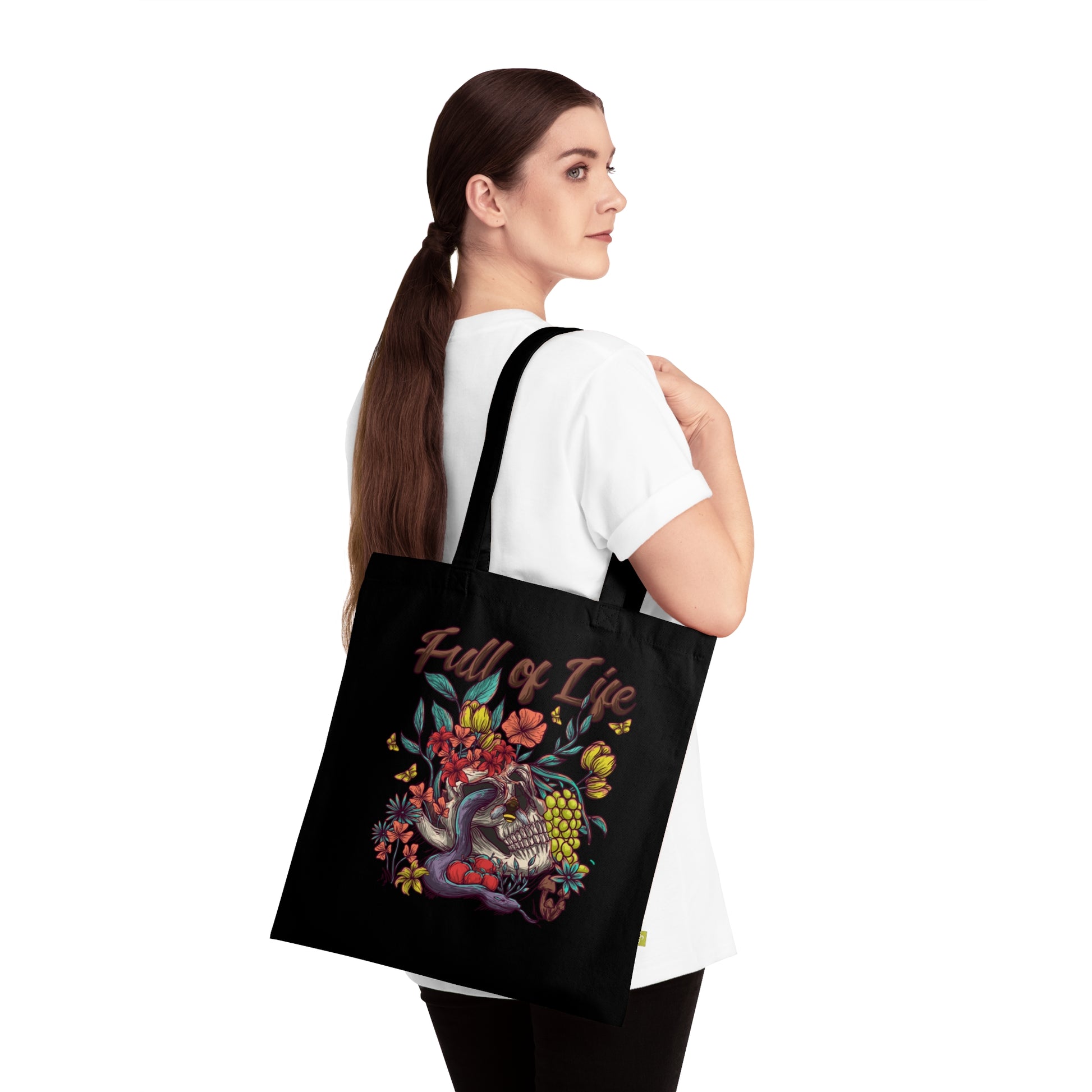 Our goth-style tote bag is inspired by the quote 'Death may be the greatest of all human blessings' -Socrates. The 'Full of Life' tote plays on the circle of life, where, from death, new life is formed. It exudes a dark yet meaningful vibe, perfect for those who appreciate philosophical quotes and distinctive designs. This tote is ideal for Halloween, goth enthusiasts, and those who appreciate in-depth conversations.