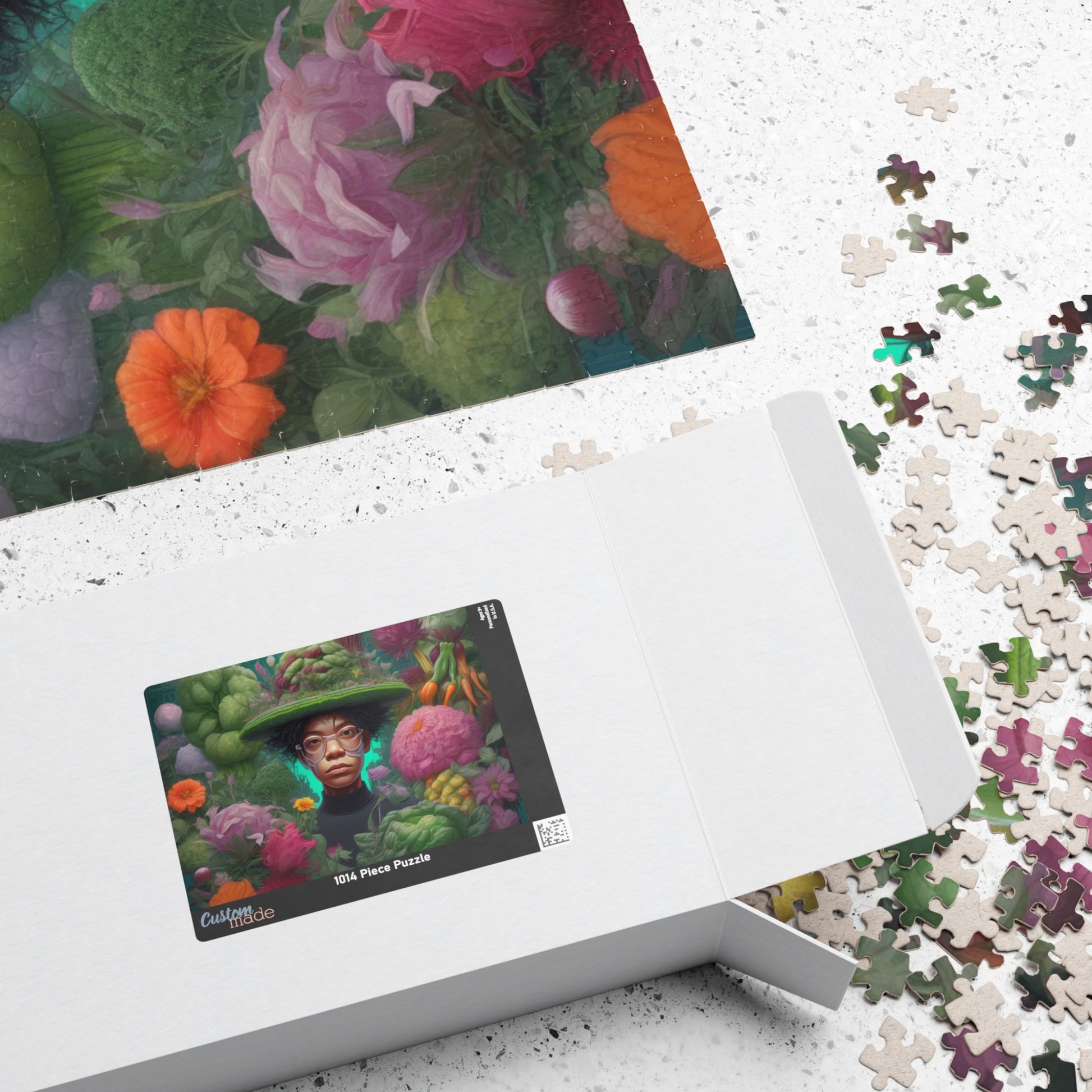 Afro-futuristic gardener puzzle suitable for kids and adults, giving off a creative and vibrant vibe. Perfect for family gatherings, relaxing evenings, and solo mindfulness moments. Ideal for art lovers and puzzle enthusiasts. Relevant for holidays, birthdays, and creative occasions.